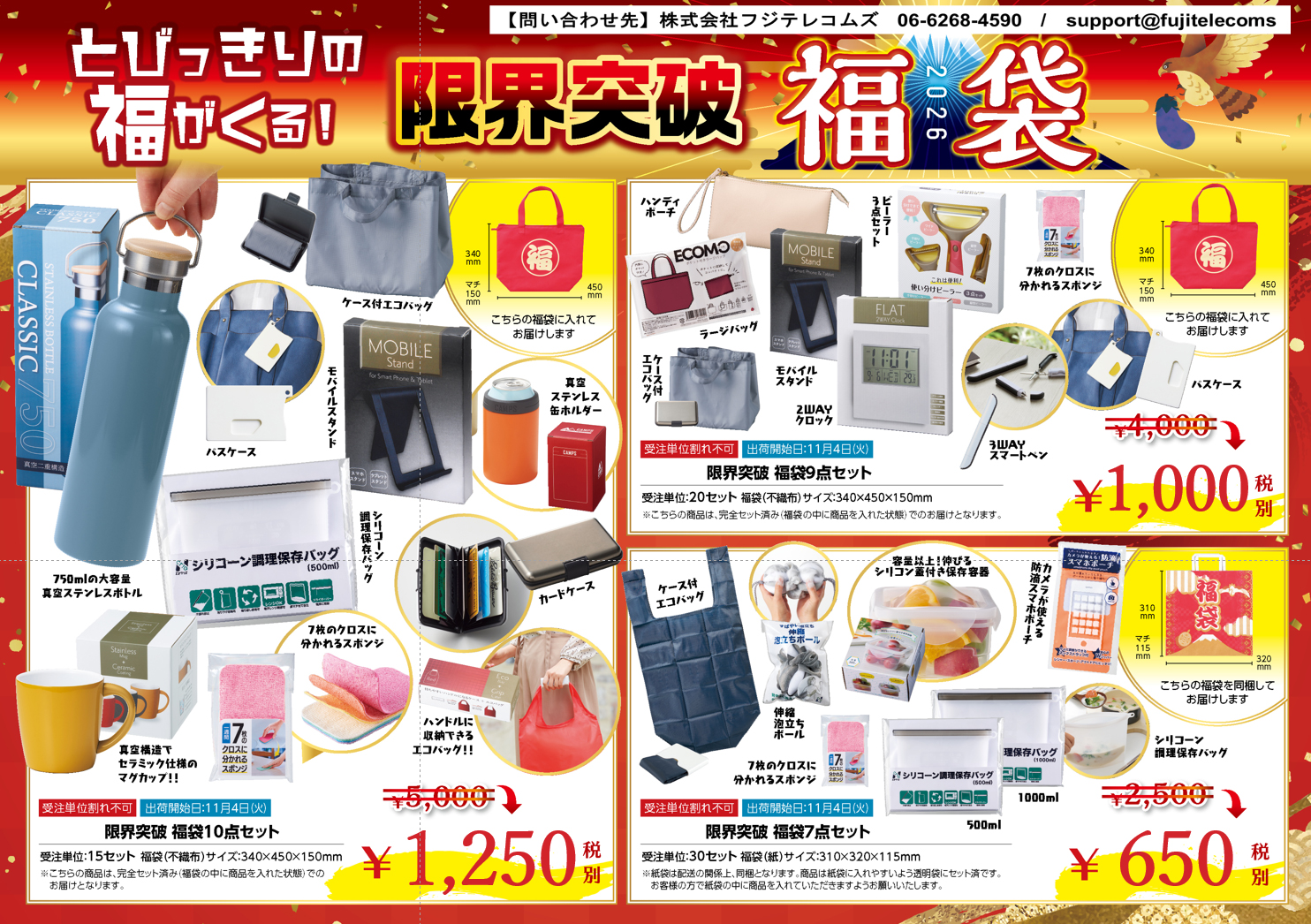 特売品 複数印刷 印刷 【期間限定!】限界突破福袋 特別ご提供価格 限界突破福袋10点セット…1,250円 限界突破福袋9点セット…1,000円 限界突破福袋7点セット…650円 お問い合わせ お気に入りに追加 ☆ 最低ロット ・限界突破福袋10点セット…15セット ・限界突破福袋9点セット…20セット ・限界突破福袋7点セット…30セット 最低納期 年内最終12/24のAMまでのご発注で12/27〜12/28着可能。 年明け1/6以降より、1/10着が最短のお届けとなります。 ※地域により異なります。ご相談下さい。 送料 800円 発送先が沖縄、北海道、離島の場合は別途送料が発生します。 ※表示価格は全て税抜きとなっております。